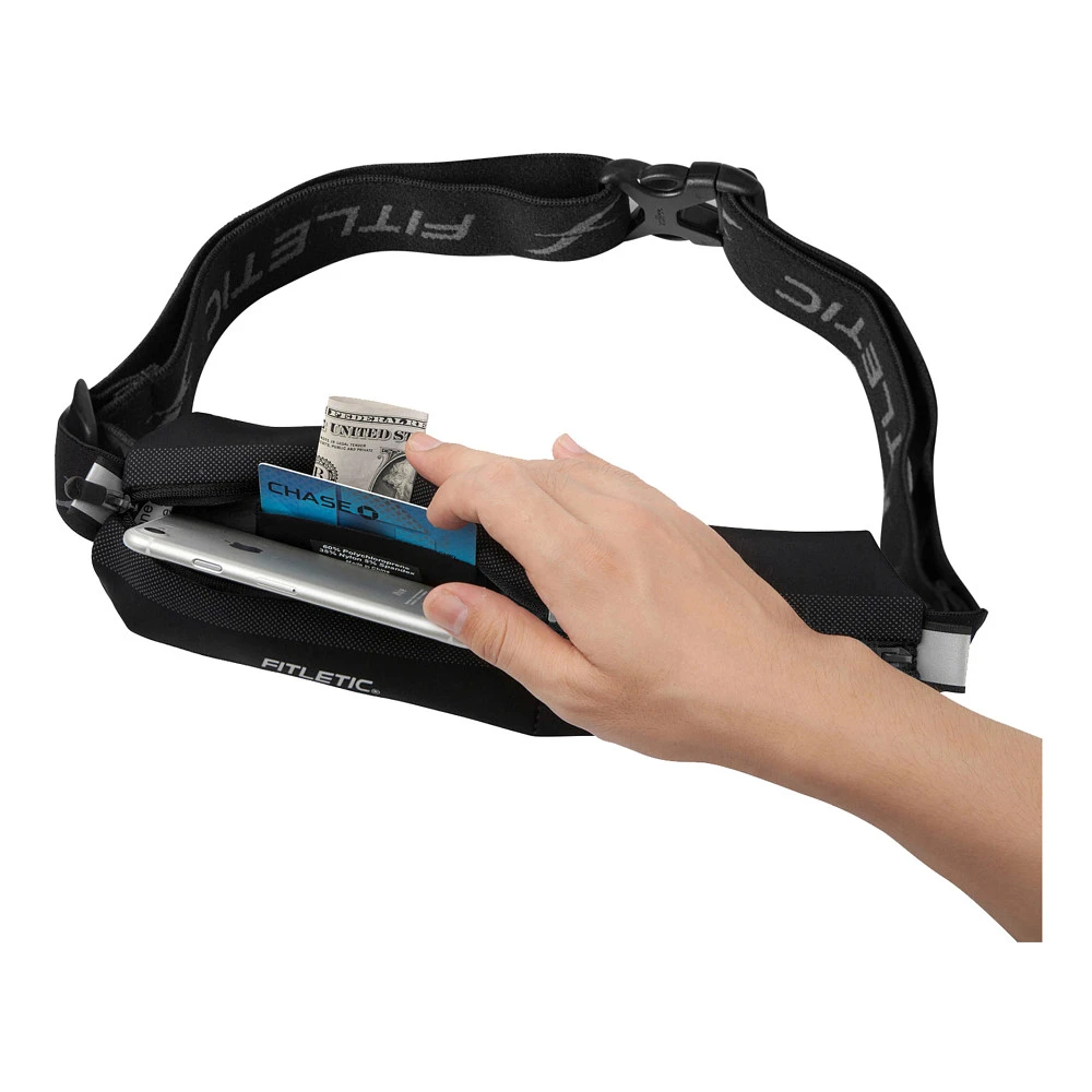 Fitletic® Bolt :: A patented design that divides and conquers. This athletic belt has two compartments, one for your phone and the other for your keys, credit cards, medical supplies, snacks or other essentials. It comes with an interior pocket for ID and cash and can be customized with add-ons like toggles. Not just for the runner, it is the perfect accessory pouch for anyone who wants to play, work, and enjoy life hands-free. Best of all, the unique fabric is waterproof so your valuables are safe from sweat and moisture.