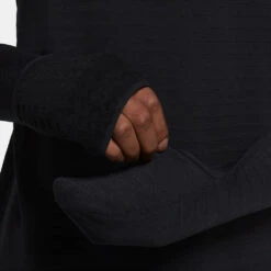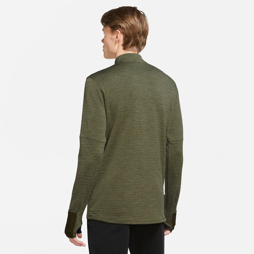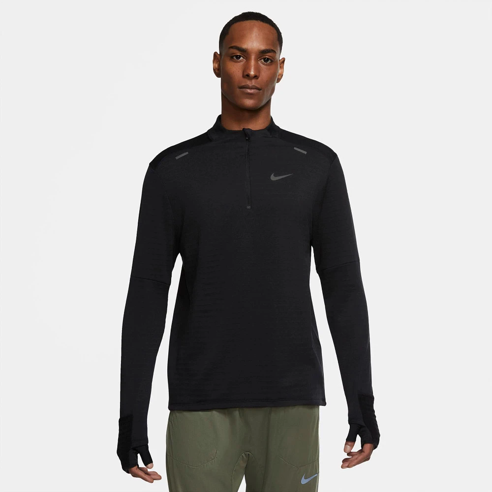 Men’s Nike® Therma-FIT Repel Element 1/2 Zip :: Umbrellas are great, but they don’t do the trick when you’re running at top speed. The Men’s Therma-FIT Repel Element 1/2 Zip is here to make your life a little easier. The water-resistant, ultra-soft fabric is made from a recycled knit material and enhanced by Nike Dri-FIT technology to wick away sweat. The updated collar has less seaming than previous versions to highlight the luxurious feel. Thumboles provide a bit of extra warmth when temperatures drop.