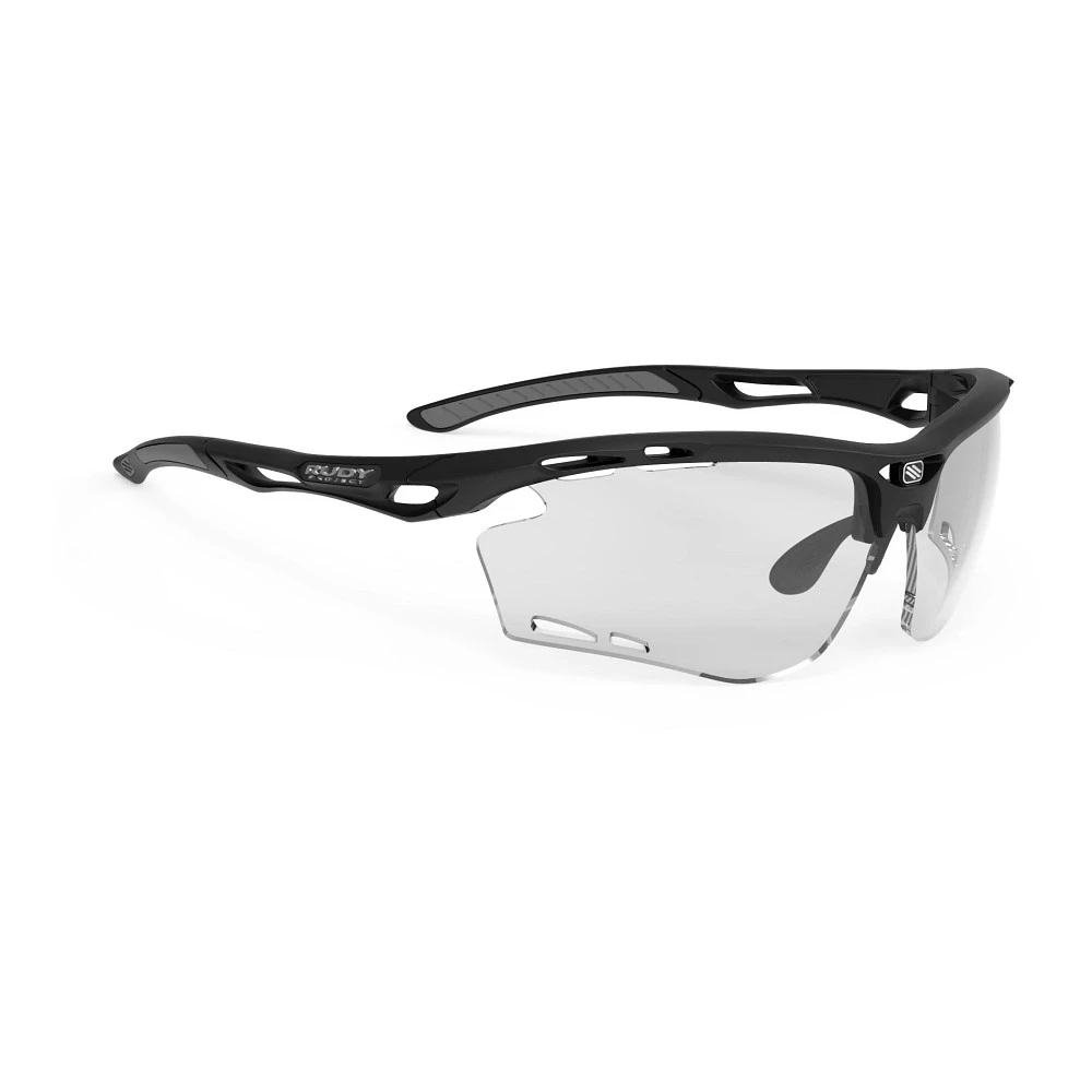 Rudy Project® Propulse – Transition Lenses :: Propulse is the model specifically designed for running: thanks to its ultra light wraparound geometry, the Propulse delivers a perfect and natural compression fit without any annoying pressure on the head. The end-result is an extremely comfortable and stable eyewear with its proprietary Hi-Grip integrated temple tips, massive vents on both front chassis, lenses and temples to efficiently prevent fogging. The wide lenses offer enhanced eye protection minimizing the risk of tearing all while offering a deep field of vision.