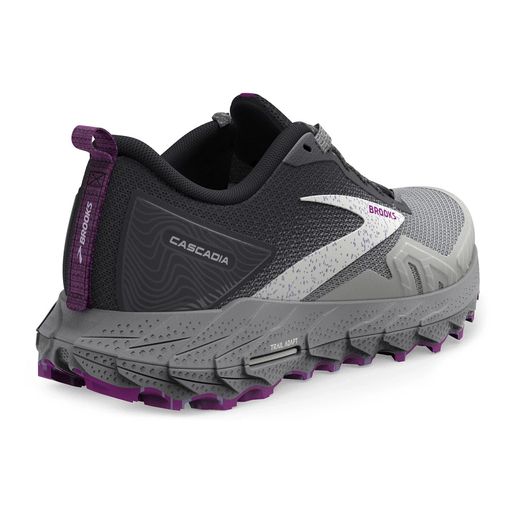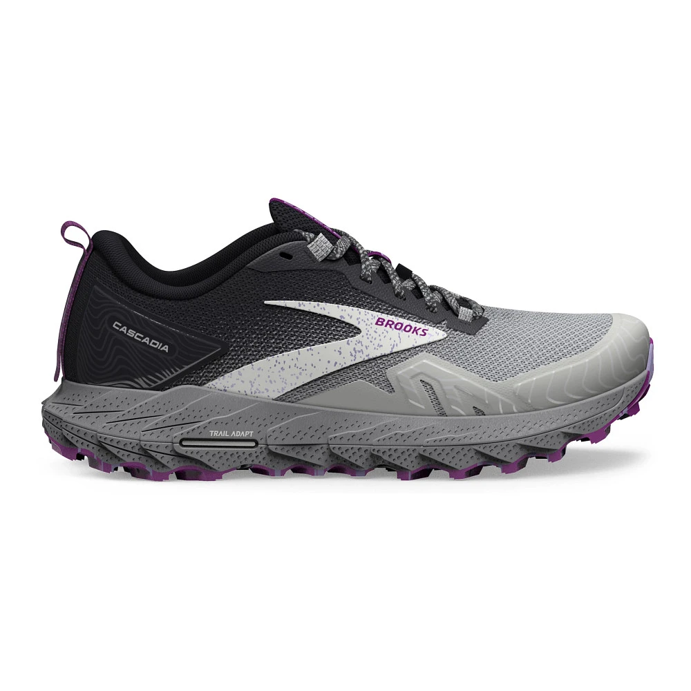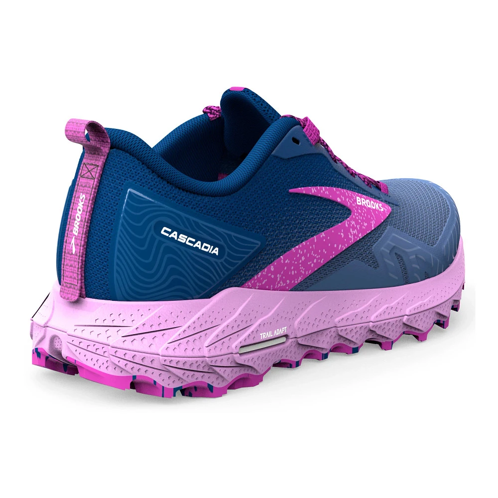 Womens’:s BROOKS® CASCADIA 17 :: A shoe as tough as you are. Your updated Women’s Brooks Cascadia 17 has all the bells and whistles you need to hit the trail with confidence. With a robust Trail Adapt System made up of midsole, rock plate and outsole, you’ll be prepared for any terrain. TrailTack Rubber technology made with 25% recycled content, provides stable wet-dry traction, just one more reason this version is a no-brainer! Show off the Cascadia 17’s unique PrintDyed upper that saves 66% of energy and 75% of water typically needed in traditional dye processes.