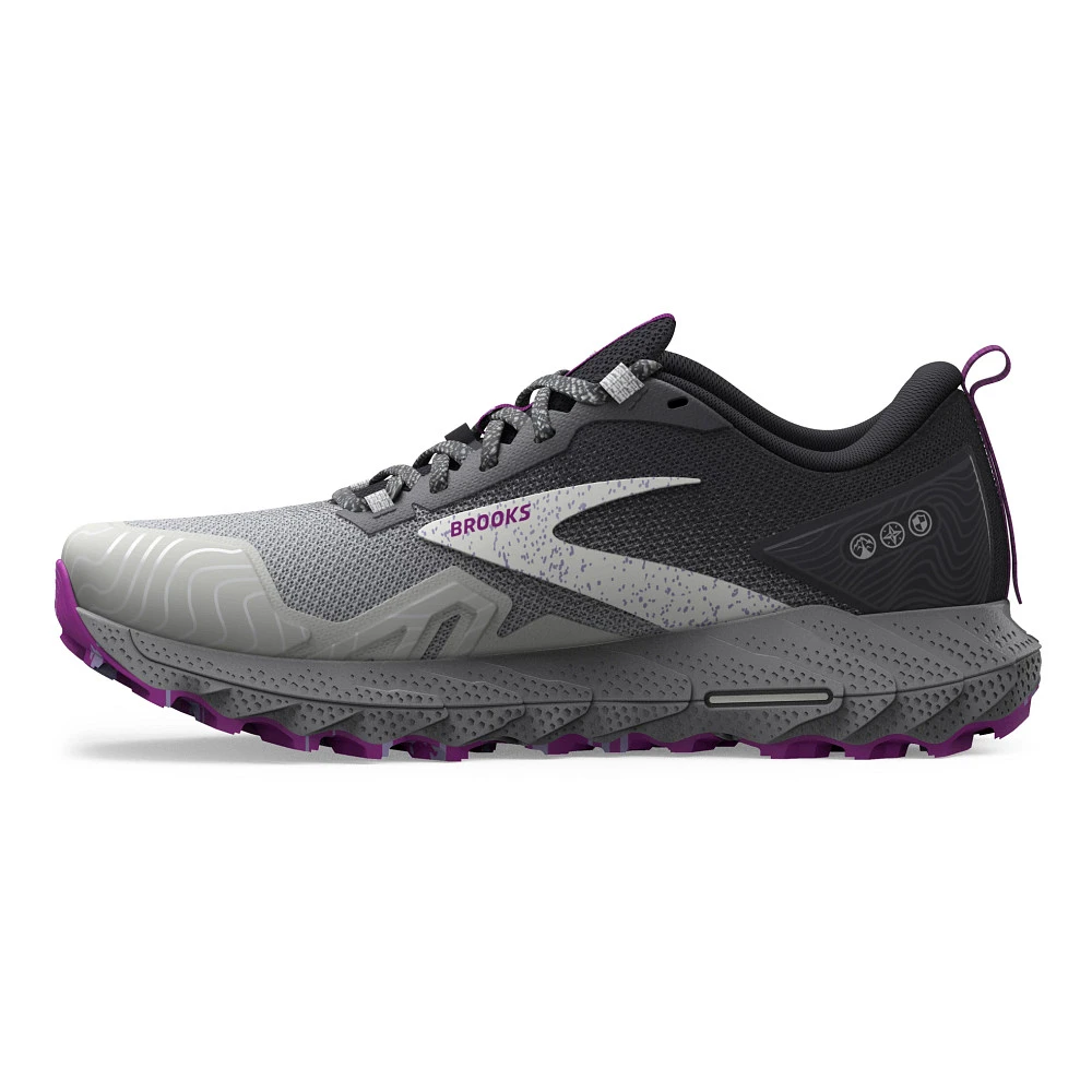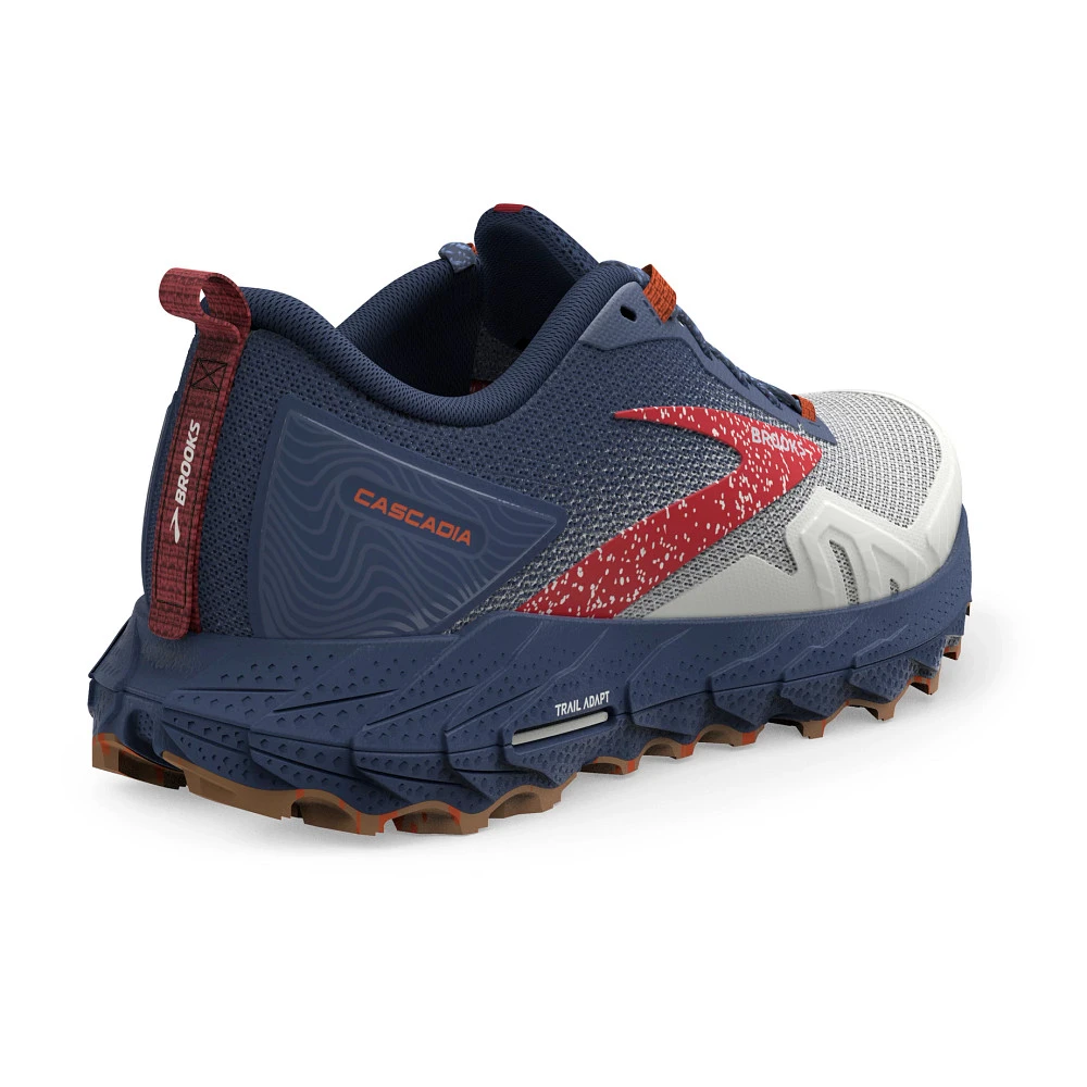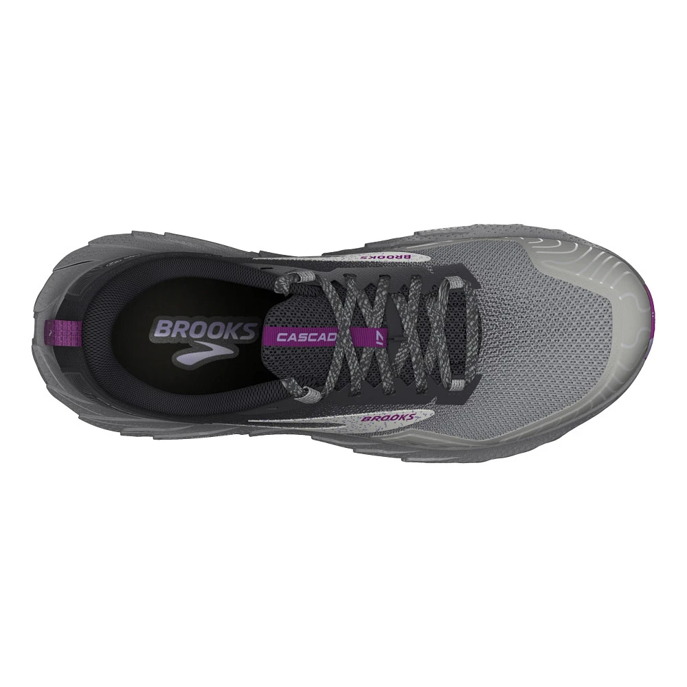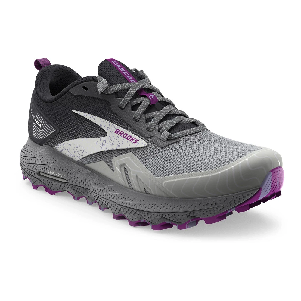 Womens’:s BROOKS® CASCADIA 17 :: A shoe as tough as you are. Your updated Women’s Brooks Cascadia 17 has all the bells and whistles you need to hit the trail with confidence. With a robust Trail Adapt System made up of midsole, rock plate and outsole, you’ll be prepared for any terrain. TrailTack Rubber technology made with 25% recycled content, provides stable wet-dry traction, just one more reason this version is a no-brainer! Show off the Cascadia 17’s unique PrintDyed upper that saves 66% of energy and 75% of water typically needed in traditional dye processes.