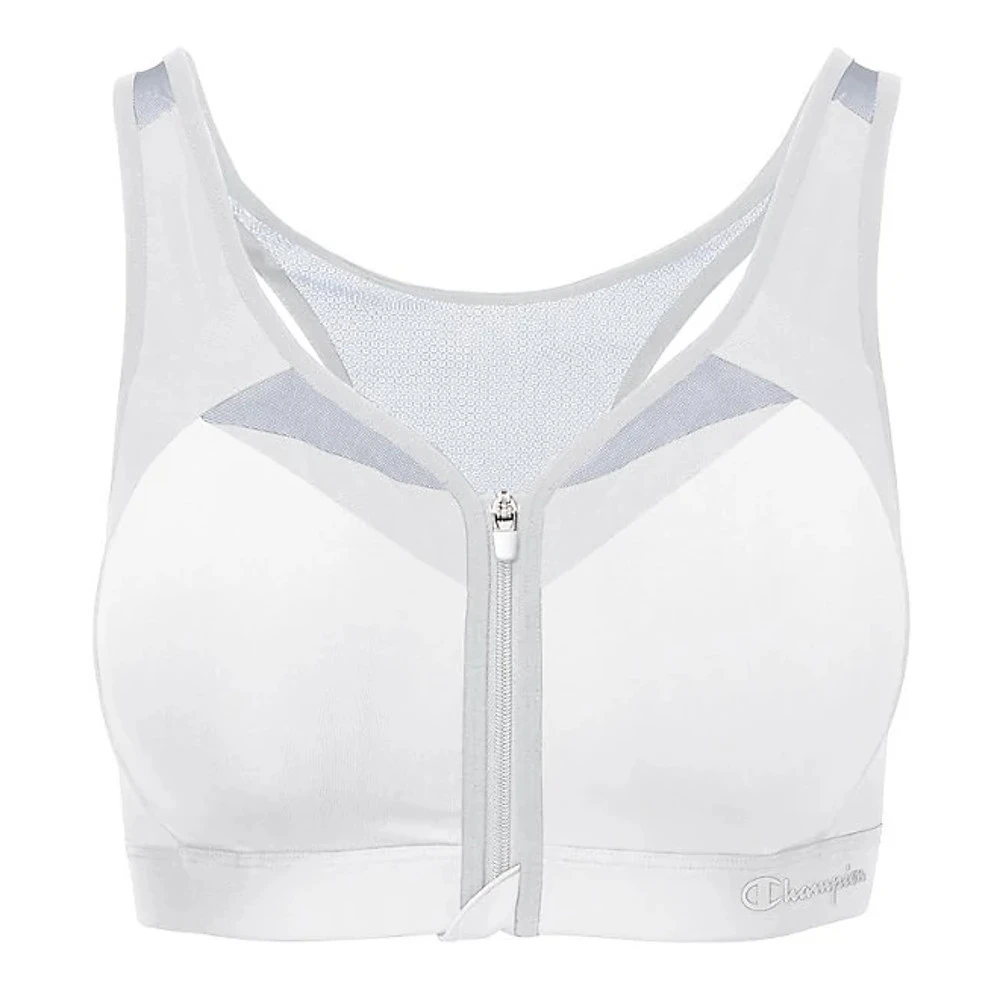 Women’s Champion® Motion Control Zip :: Workout and train with an unprecedented level of comfort and control with our Zip Front Motion Control Sports Bra. Innovative Motion Control cups provide Maximum support during intense activity with targeted zones for support, stretch and breathability. Double Dryâ„¢ technology wicks sweat away and keeps you drier. Front zip close for easy on and off. Reinforced laminate side panels for added support. Available in cup and band sizes for fit flexibility. Mesh, fashion racerback helps keep you cool. Back adjustable straps.