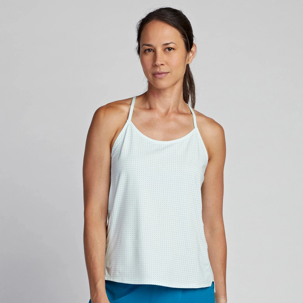 Women’s Korsa Cadence Run Singlet 2.0 :: Your daily running frequent flyer. Lightweight and moisture-wicking knit mesh construction gives you maximum ventilation while intertwining skinny straps give you a distraction-free feel. Featuring reflective dotting that offers low-light safety, flatlock seams to eliminate chafing, longer back coverage, and bonded vents for added cooling, this singlet is your reliable companion.