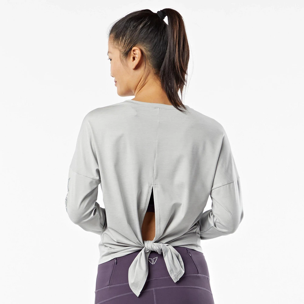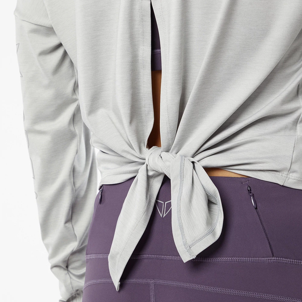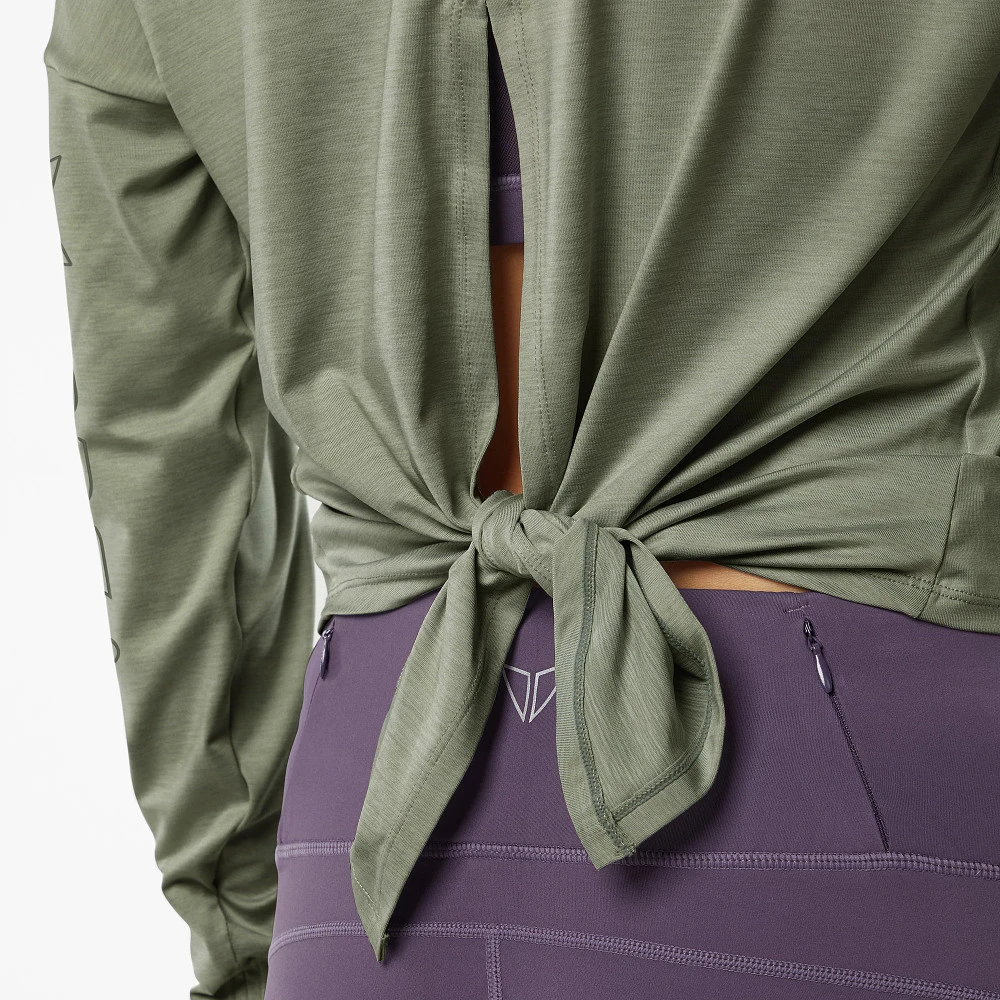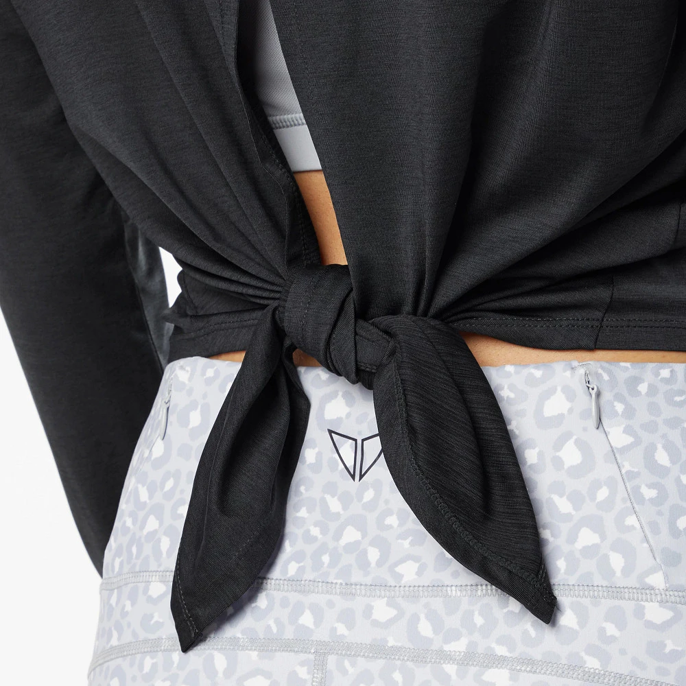 WHY YOU NEED IT: Charge your workouts looking as good as you feel with a tie back long sleeve top that moves with you.